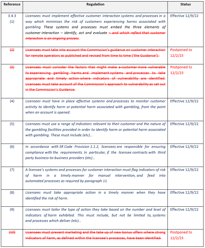 The Commission further stated that due to all of this, the ‘postponed’ parts of SRCP 3.4.3 and the Guidance will come into effect on 12th February 2023 (“subject to consultation”). So, as of 12th September 2022, licensees are faced with a situation in which the detailed guidance for a crucial element of their social responsibility compliance, an area subject to frequent, severe enforcement action, is at best uncertain and, ostensibly, missing.