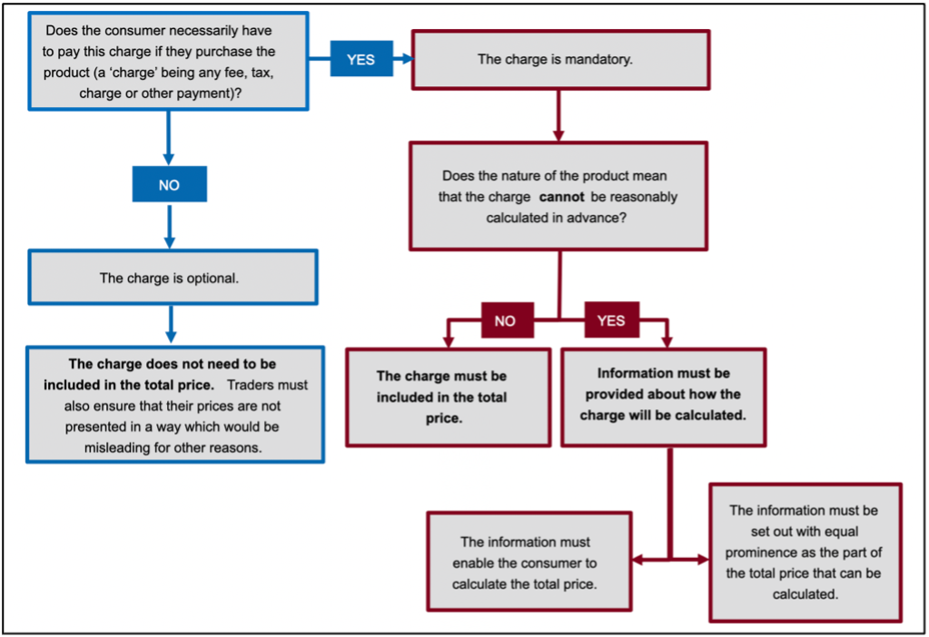 The summary guidance also includes helpful practical examples of how the rules operate in different scenarios, alongside mock-ups showing how information might be presented on a website. In addition, the CMA provides a helpful flowchart that helps organisations determine what information must be included in the price stated in an invitation to purchase, as follows:
